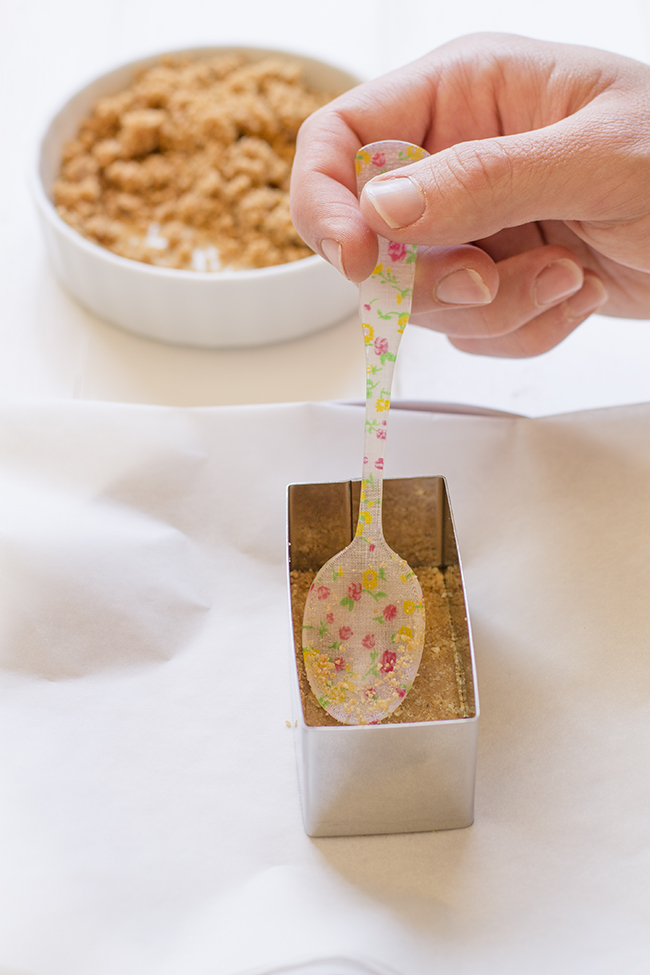 - Añadimos la base de galletas en los moldes, con una cuchara repartimos bien para que quede uniforme.