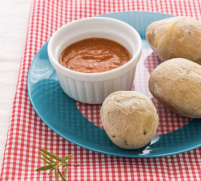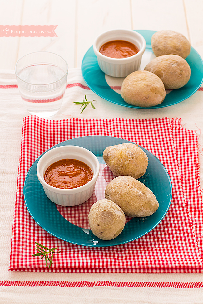Servimos las patatas en una cazuela de barro o en un plato con la salsa mojo picón para que cada comensal pueda cortar las patatas y acompañarlas con la salsa de mojo picón.