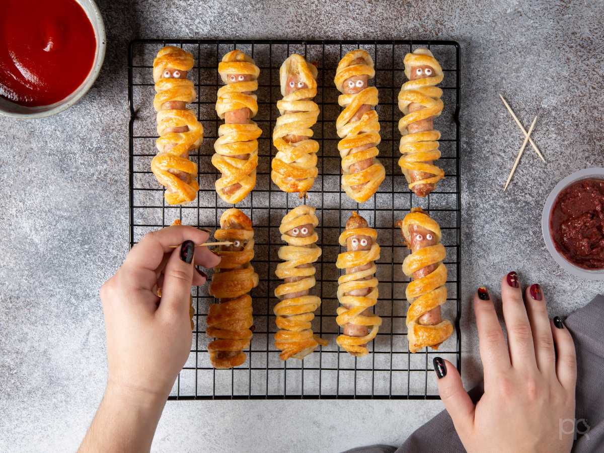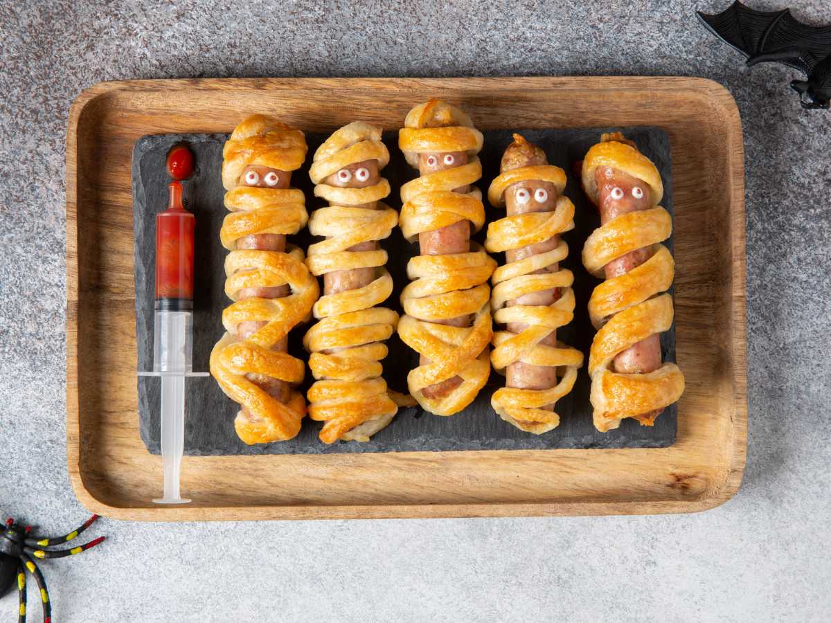 Las Momias de Salchichas con hojaldre son una de las recetas de Halloween más fáciles y divertidas.