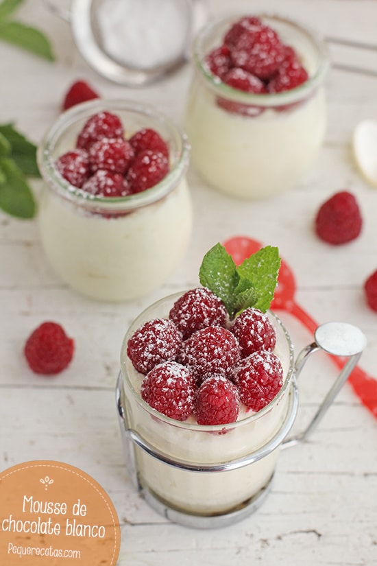 Hemos acompañado esta mousse de chocolate blanco con unas frambuesas, pero podéis ponerle cualquier otro fruto rojo: unas fresas, unas moras, arándanos, grosellas… lo que más os guste, incluso una mezcla de varios ya que contrastan muy bien con el dulce del chocolate blanco y estéticamente quedan preciosos, ¿verdad?