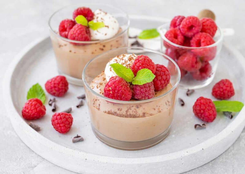 Presenta tu mousse de chocolate en vasitos individuales acompañada de nata montada o crema chantilly y unas frambuesas, espolvoreando por encima chocolate rallado, luego decora con unas hojitas de menta ¡verás qué combinación de sabores tan buena!