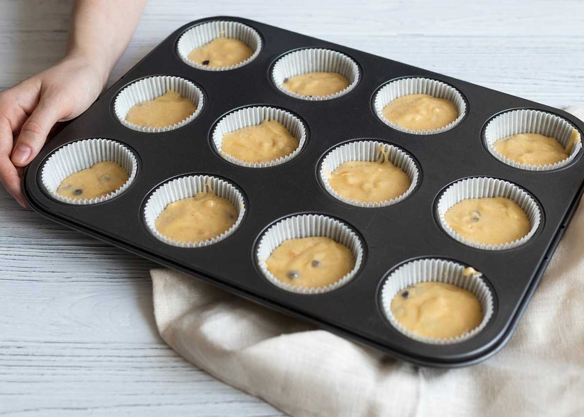 • Después de la fase de reposo, saca la masa de la nevera y divídela uniformemente en los moldes, llenando 2/3 del molde.
