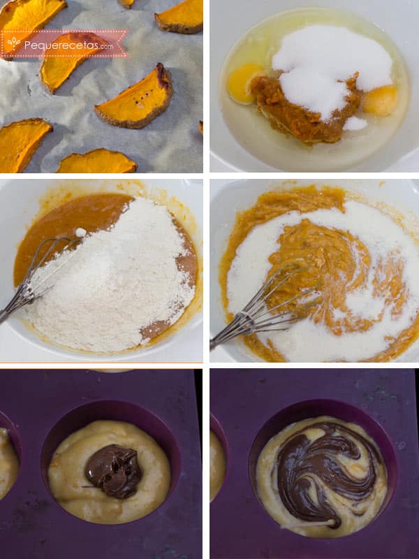 Cortamos la calabaza en rebanadas finas y la asamos en horno precalentado a 200°C por 15 o 20 minutos, o hasta que estén tiernas. Retiramos y hacemos un puré. Mezclamos el puré de calabaza con el azúcar, el aceite y los huevos.