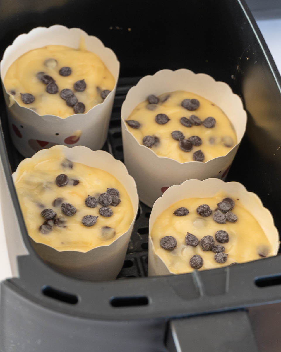 En este caso nos hemos decantado por preparar unos deliciosos muffins de yogur con pepitas de chocolate, pero obviamente podéis utilizar vuestra receta favorita de muffins (en este enlace podéis encontrar todas nuestras recetas de muffins por si necesitáis inspiración) y simplemente seguir los pasos de horneado en freidora de aire que os indicamos.