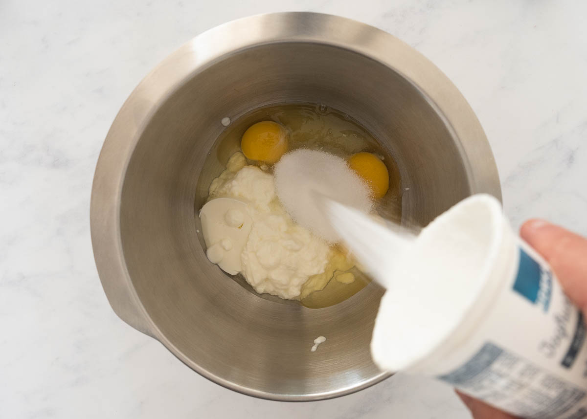 Precalentamos la freidora de aire durante 5 minutos a 150°C. Mientras tanto en un bol amplio batimos el yogur con los huevos y el azúcar hasta tener una masa homogénea.