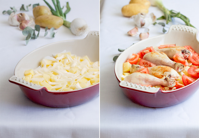 Transcurrido el tiempo, retiramos la cazuela del horno, incorporamos los muslos de pollo, el tomate en gajos y vertemos el caldo de pollo, una pizca de sal más y un toque de pimienta, por último una cucharadita de aceite de oliva. Llevamos de nuevo al horno hasta que el pollo esté bien dorado y los tomates asados, aproximadamente 40 minutos a 180º, calor arriba y abajo.