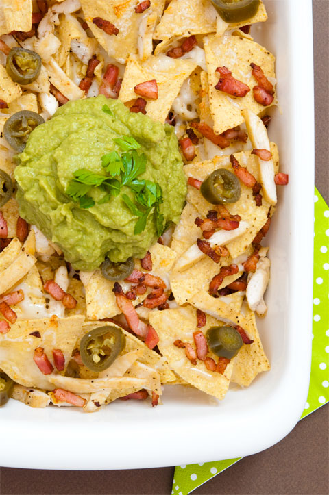 Cómo hacer nachos con guacamole, pollo, bacon, queso y jalapeños