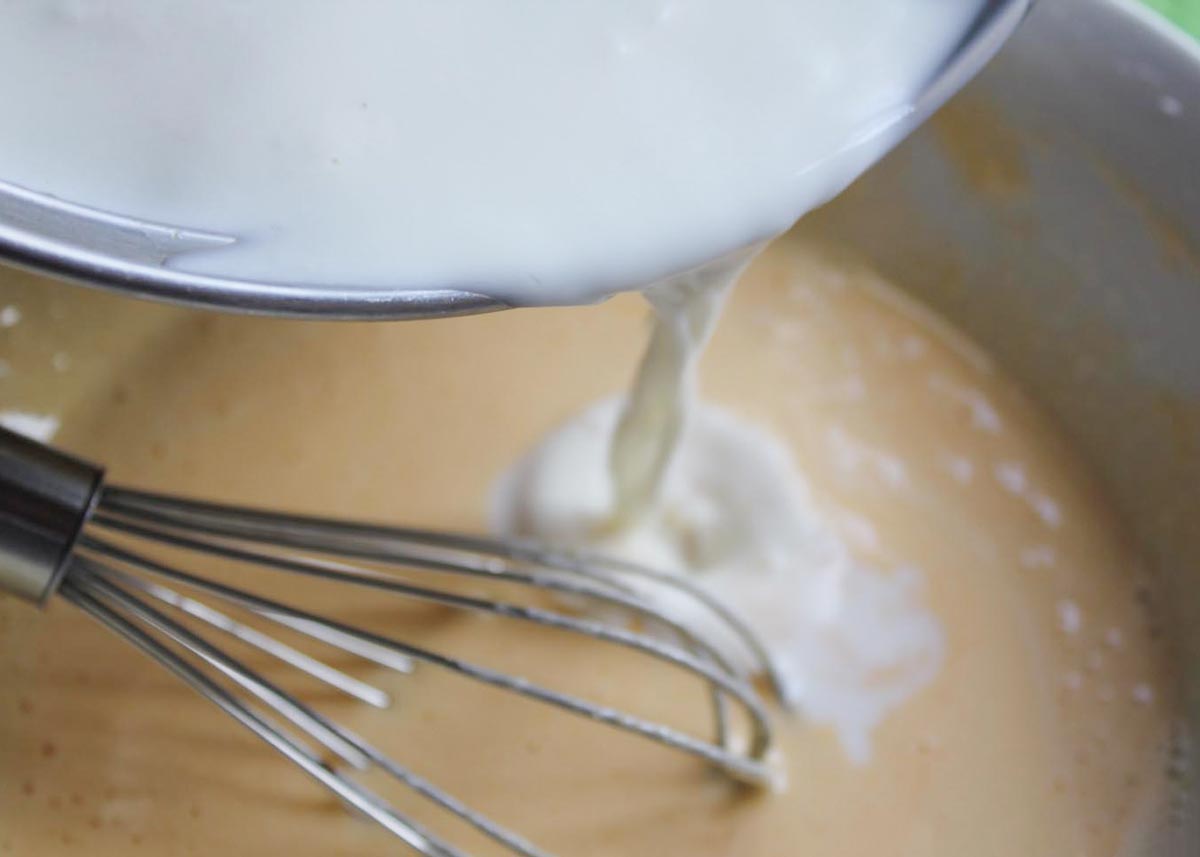 - Agrega la leche poco a poco. Agrega la leche poco a poco a la mezcla de huevo, maicena y azúcar mientras revuelves constantemente para evitar que la mezcla se corte.