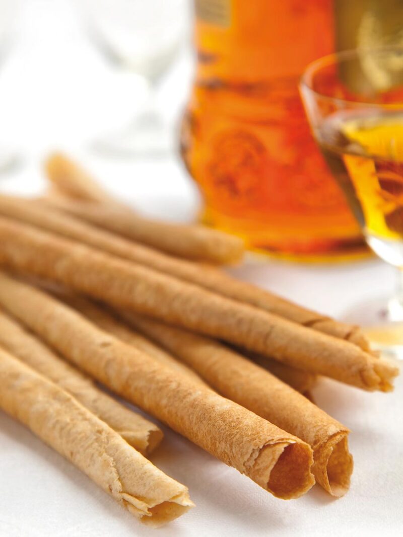 Las neules se sirven tradicionalmente con cava, pero también son ideales para disfrutar con chocolate caliente o café.