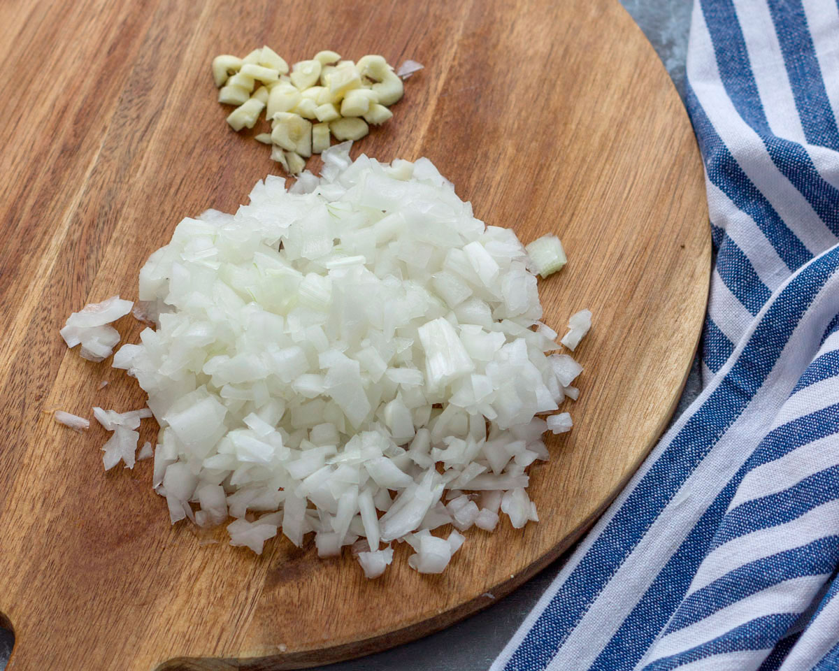 - Primero, pela y pica finamente la cebolla y el ajo.