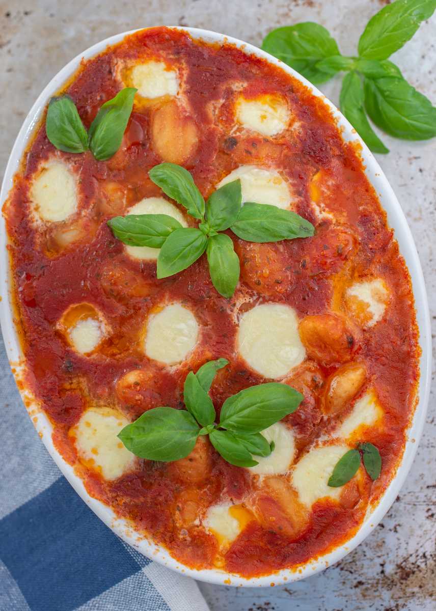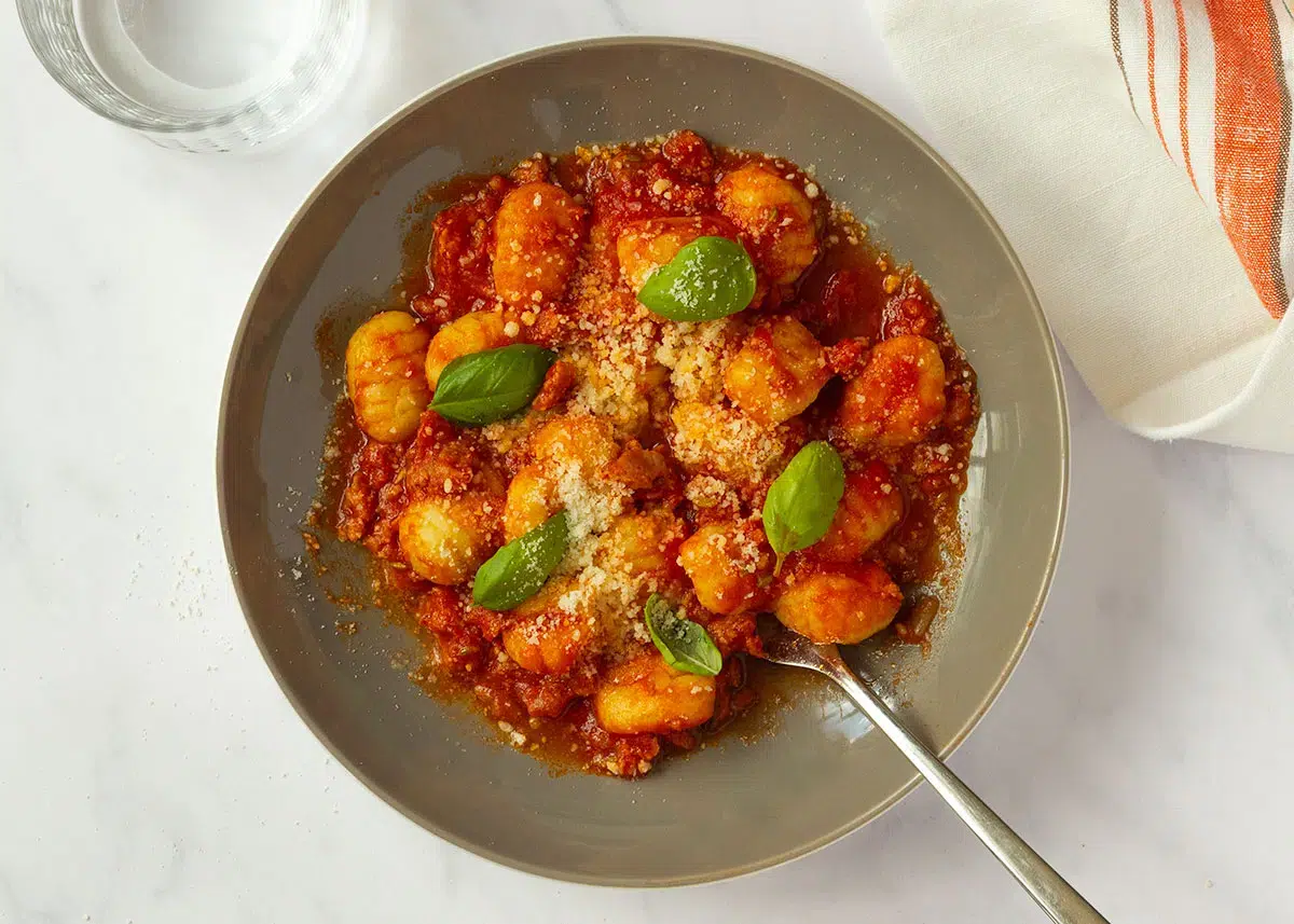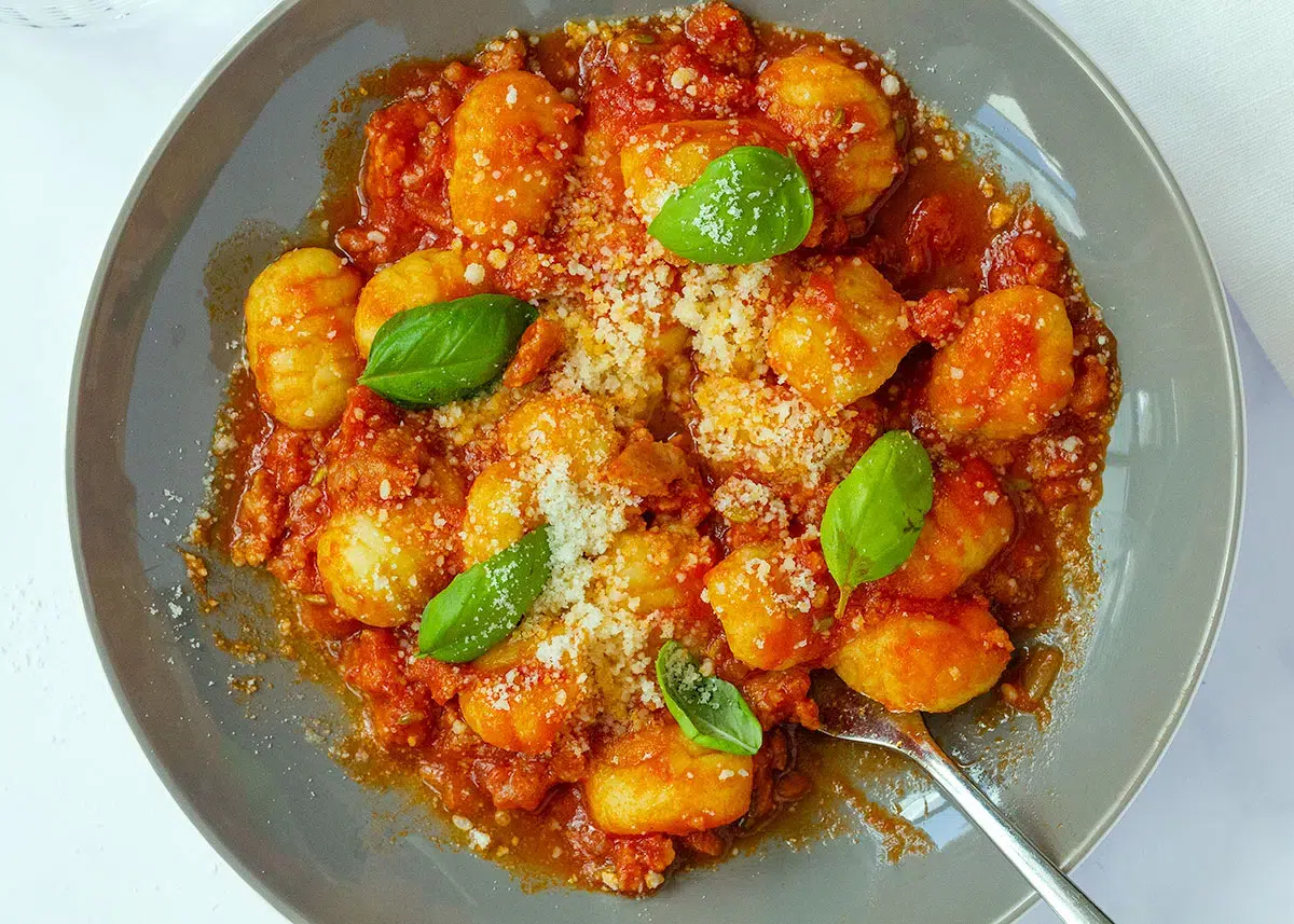 - Sirve los gnocchi con salsa de tomate y salchichas adornados con hojas frescas de albahaca y una generosa cantidad de parmesano rallado.
