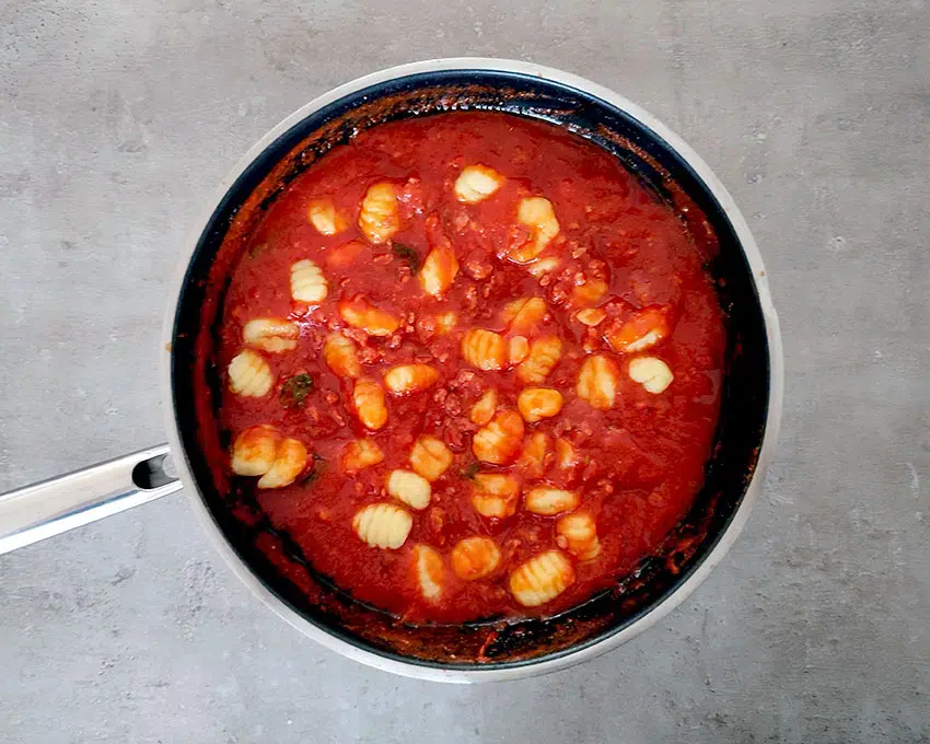 - Una vez cocidos los ñoquis, añádelos a la salsa de tomate caliente en la sartén.