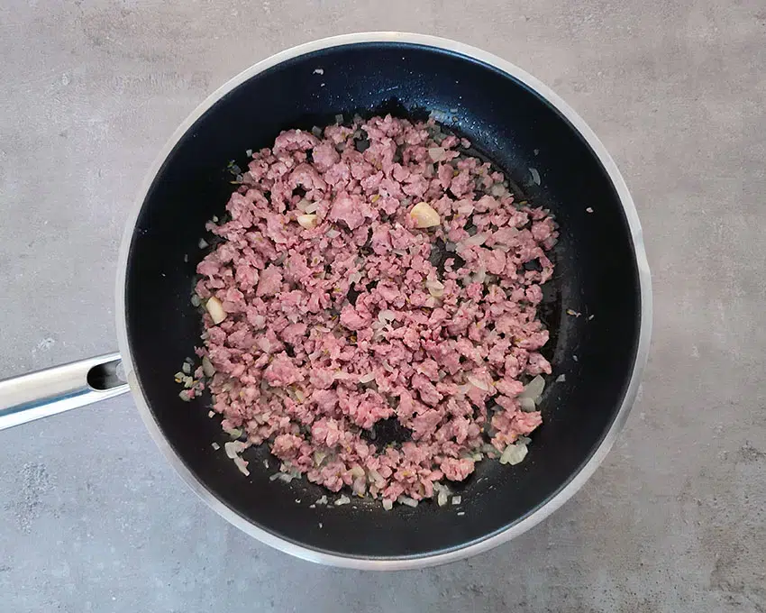 - Añade la carne picada y cocina hasta que esté dorada y cocida por completo. Escurre el exceso de grasa si es necesario.