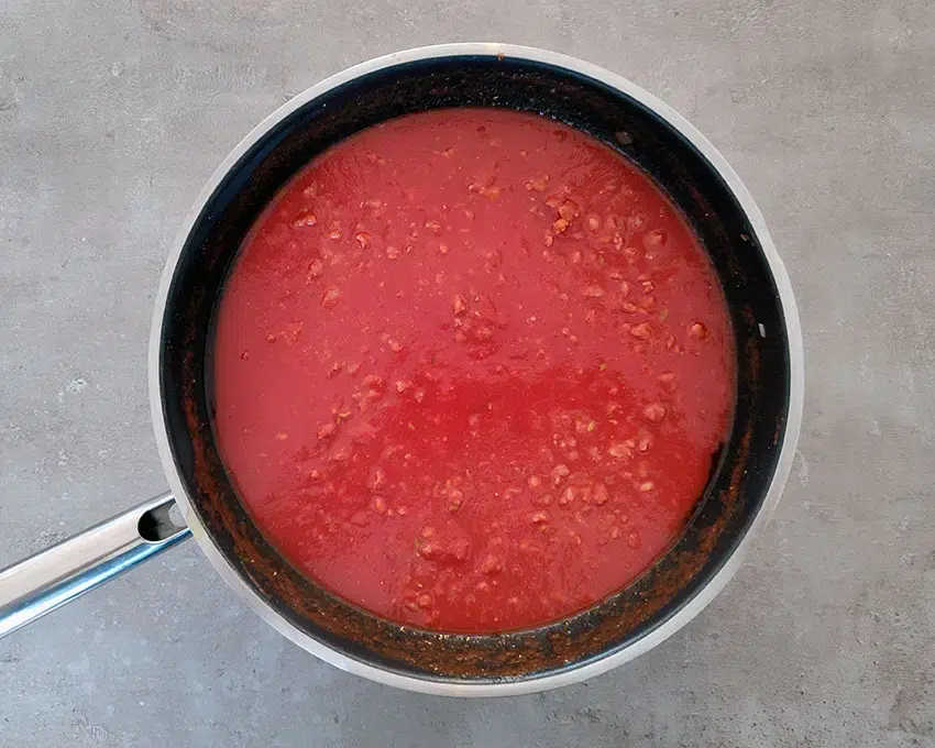 - Agrega los tomates triturados y cocina durante unos 10 minutos, o hasta que la salsa espese ligeramente.