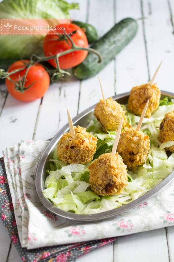 - Con las manos mojadas, vamos cogiendo el pescado y le vamos dando forma de bolita, pasamos las bolitas por harina, luego por los huevos batidos y luego por los copos de maíz triturados con el robot de cocina.