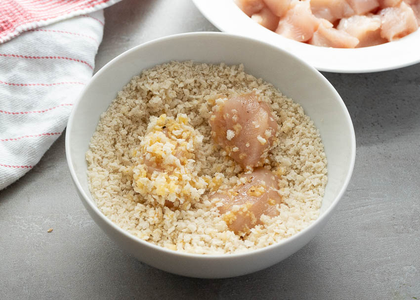 Vamos rebozando cada trozo de pollo primero en la mezcla de huevo y luego en el panko, apretando ligeramente para que se quede bien pegado y completamente cubierto.