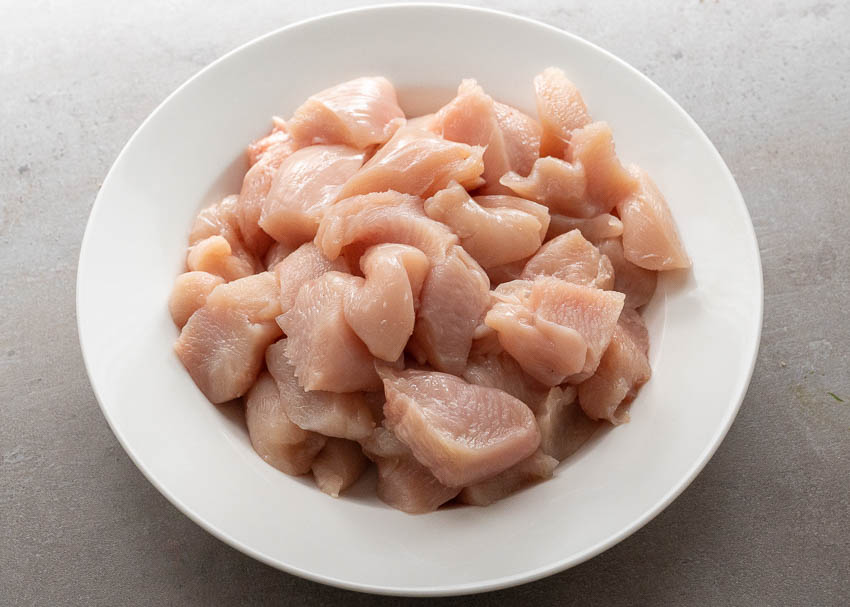 Limpiamos las pechugas de pollo de grasa, las cortamos en dados y las reservamos.