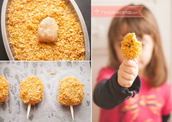 Como os decía poco importa la forma que le demos, estos nuggets de pollo ¡son siempre riquísimos! Con la forma de polo o piruleta son perfectos para una fiesta infantil, en cambio para una cena entre adultos podéis prepararlos en forma de albóndiga, yo en casa los hago así y desaparecen en pocos minutos. El secreto de la cubierta tan dorada y crujiente es que para rebozarlos utilizo copos de maíz. Pero vayamos a ello…