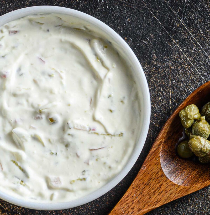 - En un tazón, mezcla la mayonesa con los pepinillos, alcaparras, jugo de limón, mostaza y perejil. Salpimenta al gusto. Refrigera hasta el momento de servir.