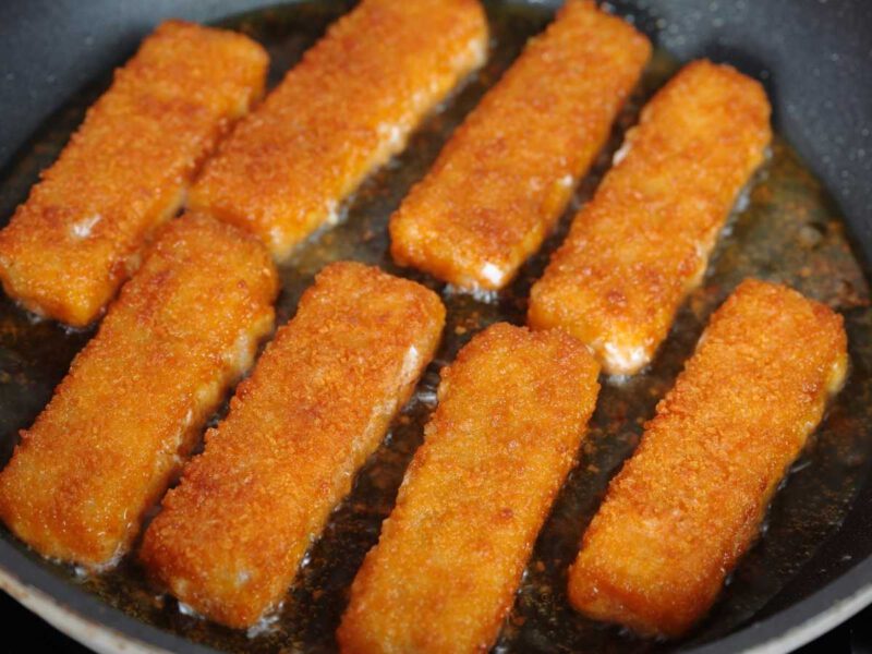 - Freír: Calienta el aceite en una sartén grande a fuego medio-alto. Fríe los palitos de pescado en tandas, de 2 a 3 minutos por cada lado, o hasta que estén dorados y crujientes. Colócalos sobre papel absorbente para eliminar el exceso de aceite.
