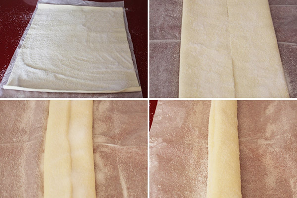 - Volvemos a espolvorear todo el hojaldre con azúcar, y doblamos de nuevo, cada lateral hacía el centro.
