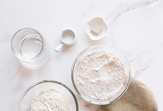 - Por un lado en un cuenco mezclamos la harina de espelta con la harina de fuerza y la sal.