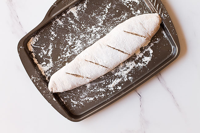 - Espolvoreamos con harina la bandeja del horno y colocamos el pan sobre ella