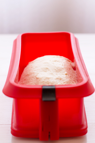 - Colocar el cilindro de masa en un molde engrasado para pan de molde con tapa* (de 500 g de capacidad) y dejar levar 75 minutos.