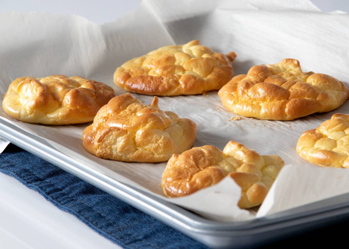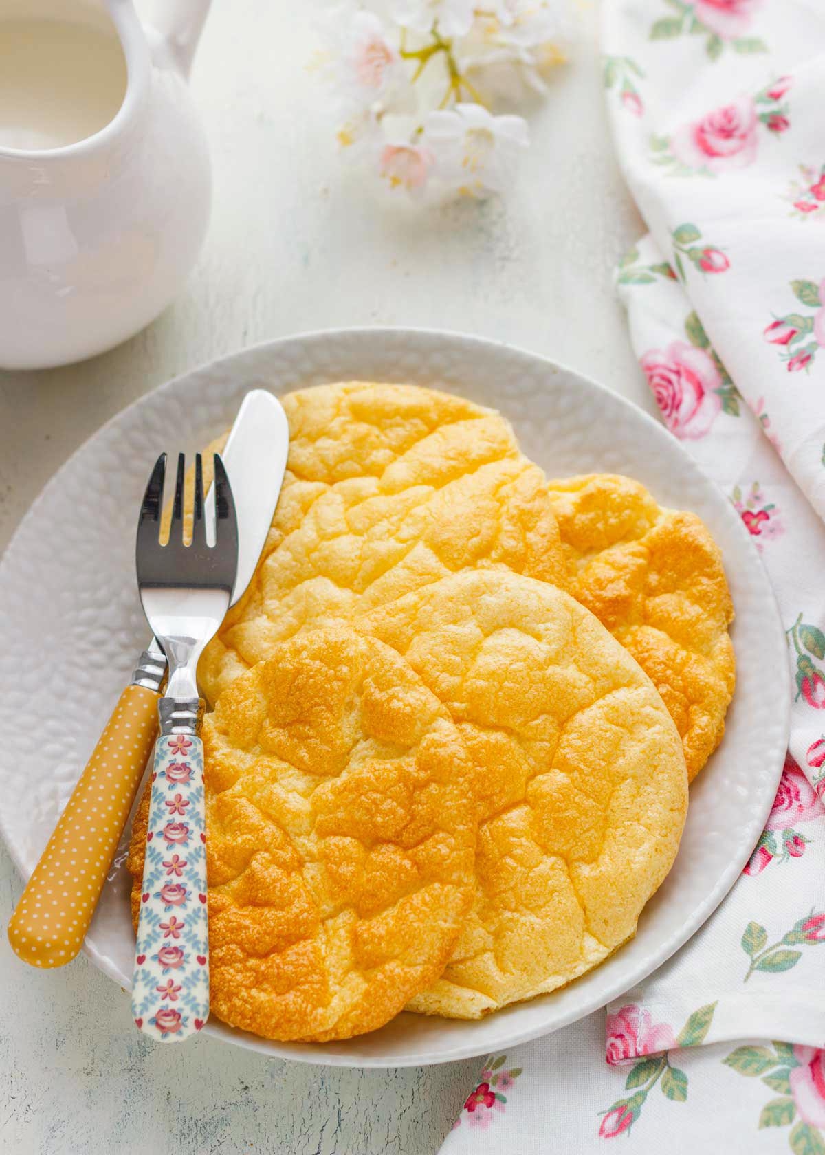 Los ingredientes básicos son clara de huevo batidas a punto de nieve, las yemas, y queso para untar tipo Philadelphia, más un poquito de cremor tártaro (te contamos también cómo puedes reemplazarlo). Es por esto que su consistencia es tan esponjosa, casi como un suflé con una capa exterior más consistente y doradita. En cuanto al gusto, su sabor es bastante neutro, y se puede saborizar con hierbas aromáticas o especias.