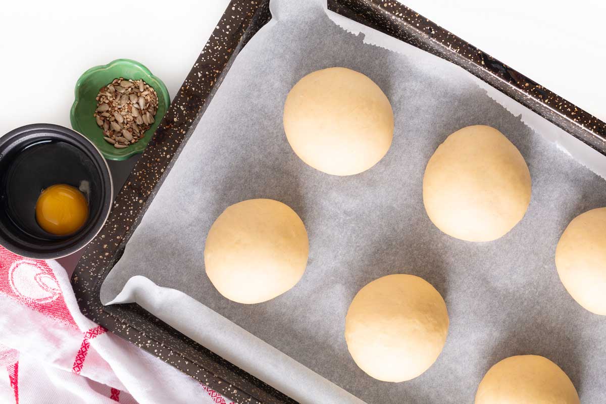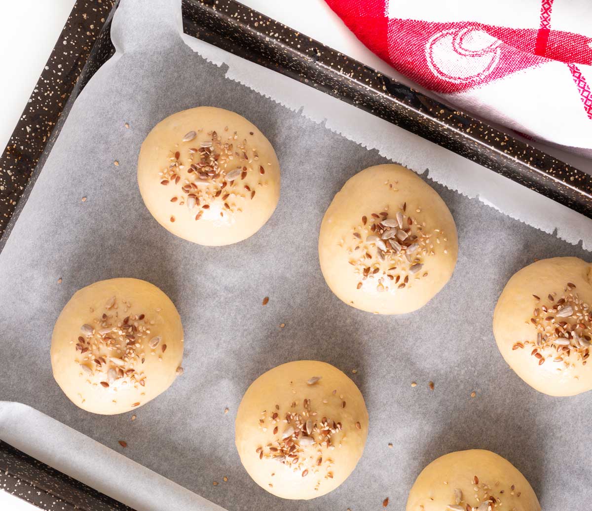 - Se pincelan los panecillos con la yema batida con un poco de agua y se espolvorean las semillas que hayas elegido, o si lo prefieres puedes dejarlo también sin semillas, pintándolo con yema de huevo batido y agua.