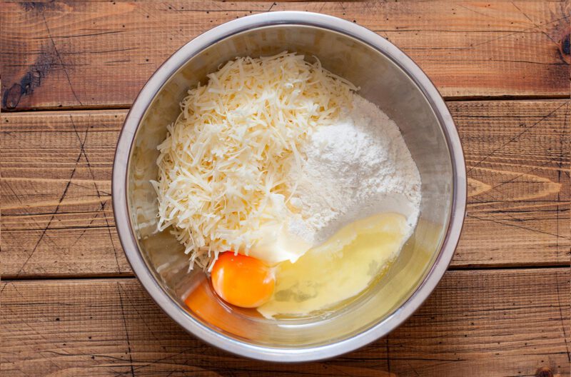 - Incorpora el queso rallado y sigue amasando hasta que todos los ingredientes estén bien integrados y la masa sea uniforme.