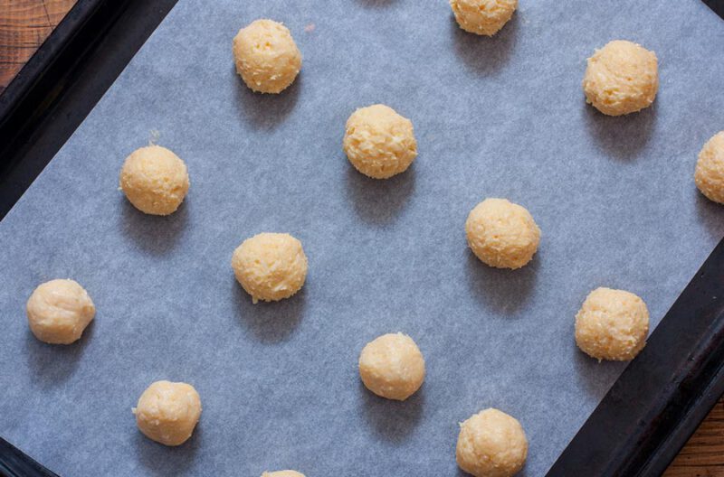 - Con las manos ligeramente engrasadas, forma bolitas del tamaño de una nuez con la masa y colócalas en una bandeja para hornear forrada con papel de horno.