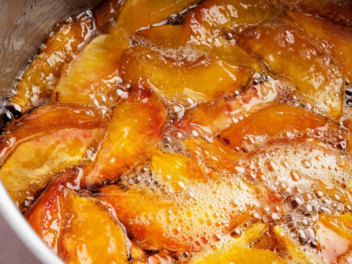 Cocemos a fuego medio durante unos 5-7 minutos, hasta que estén muy blandos. Si los melocotones están ya muy maduros, bastará con calentar un par de minutos.