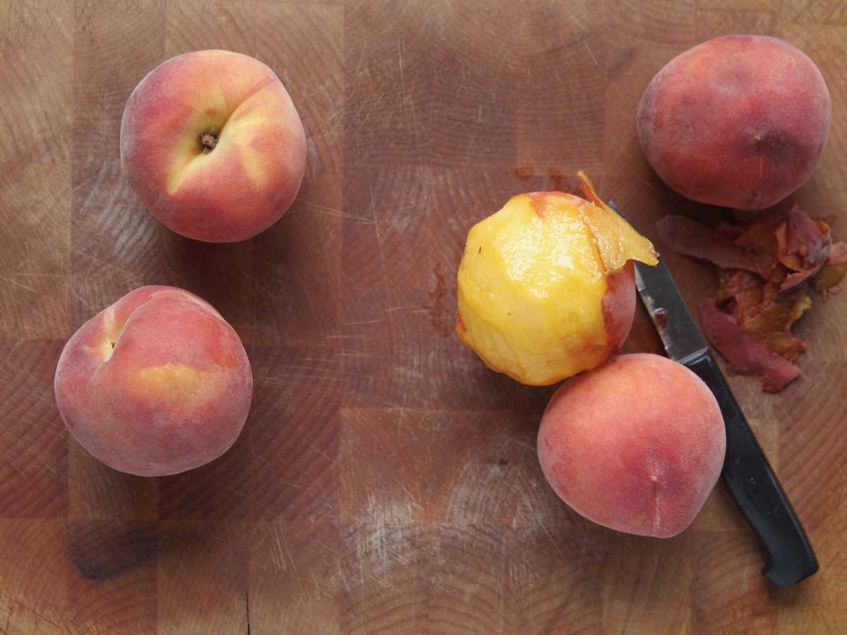 Pelamos los melocotones y les quitamos el hueso. Si están muy maduros, la piel sale casi sola.