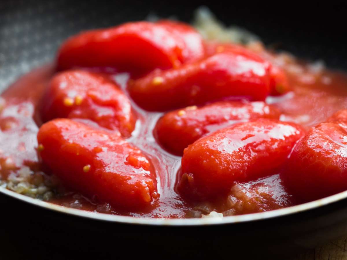 - Agrega los tomates pelados a la sartén y aplástalos ligeramente con una cuchara de madera.