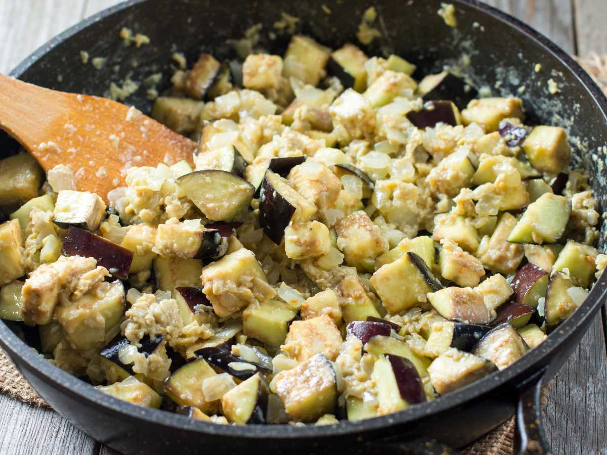 - Cuando estén dorados, retíralos y añade la berenjena.