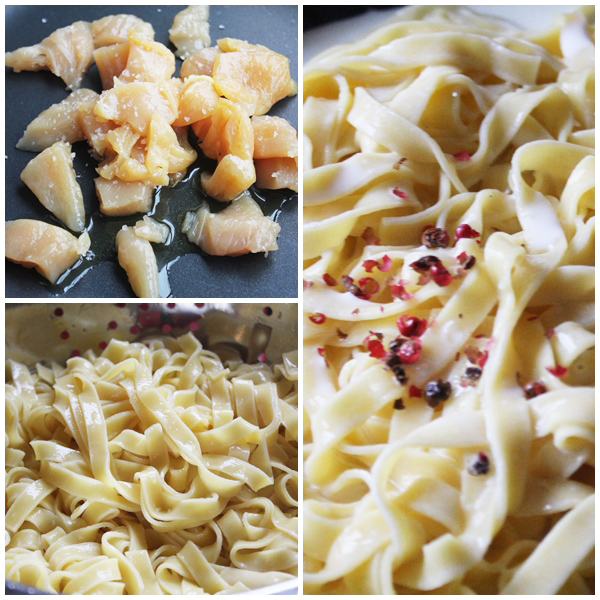 En esta ocasión hemos usado tallarines de pasta fresca, que en apenas cuatro minutos están listos. Solo tenemos que saltear el pollo troceado —sin hueso, por supuesto— y mezclarlo con la pasta cocida y una salsa de nata ligera, aromatizada con un toque de pimienta rosa. El resultado: unos tallarines con pollo y nata suaves, cremosos y con un sabor delicado que apetece repetir.