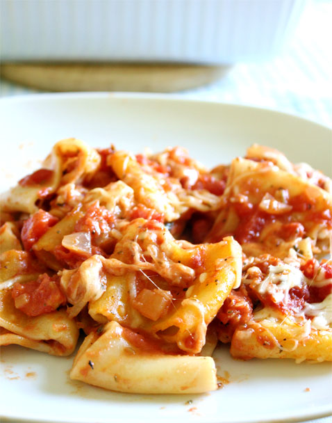 - Ponemos el horno a precalentar a unos 200º. En un recipiente para el horno, cubrimos el fondo ligeramente con aceite de oliva y vertimos la pasta con la salsa de tomate y mozzarella, repartiéndola bien por todo el recipiente.