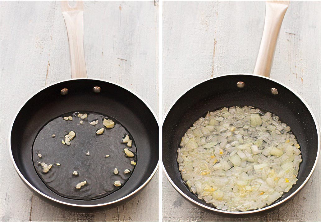- Picamos finamente el ajo y la cebolla. Echamos unas cucharadas de aceite de oliva en una cacerola, añadimos el ajo y la cebolla y lo doramos.