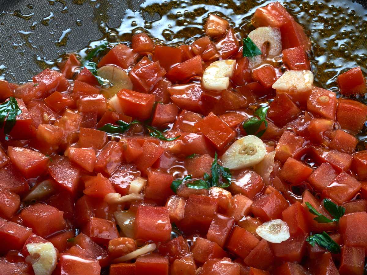 - Añadimos los tomates, la sal, la pimienta y unas hojas de albahaca cortadas en pequeños trozos.