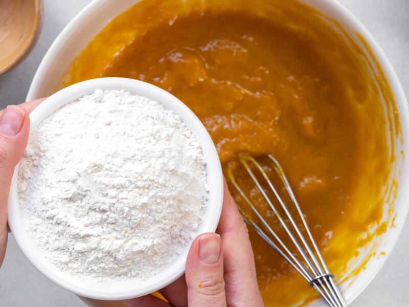 - Tamizamos la harina junto con la canela, nuez moscada, levadura y sal. Añadimos poco a poco a la mezcla de boniato, incorporándola suavemente con una espátula o una cuchara.