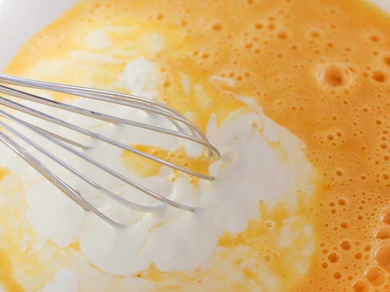 - Batimos los huevos en un cuenco grande, añadimos la nata líquida y batimos con una pizca de sal y otra de pimienta.