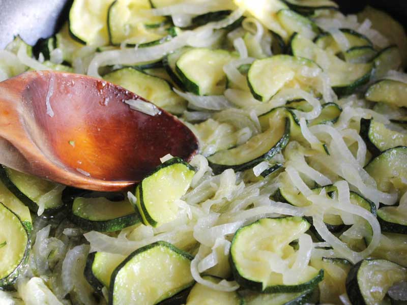 - Ponemos ambas cosas, la cebolla y el calabacín a pochar en una sartén con aceite de oliva virgen extra. Reservamos.