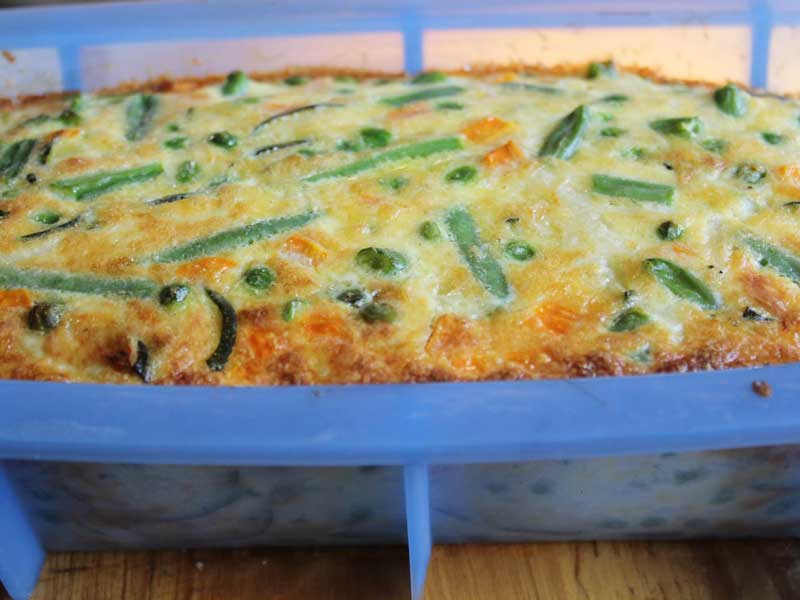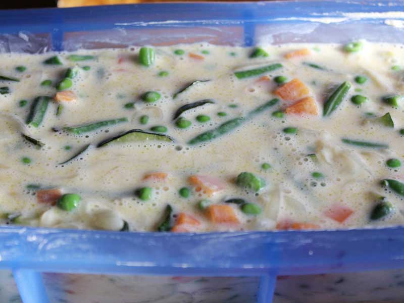 He utilizado esta vez guisantes tiernos y judías verdes congeladas, pero podéis utilizar la verdura que tengáis, este pastel es un estupendo “limpianeveras” ya que admite casi todo.