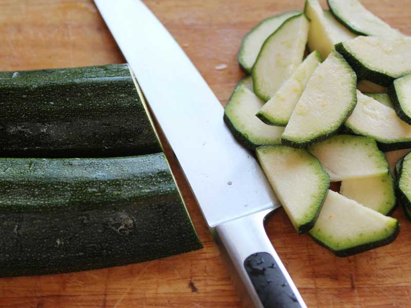 - Lavamos muy bien el calabacín bajo el chorro de agua del grifo, despuntamos y cortamos en medias rodajas, dejando la piel.