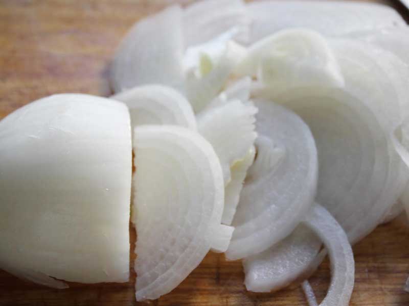 - Pelamos la cebolla y cortamos en rodajas finas.