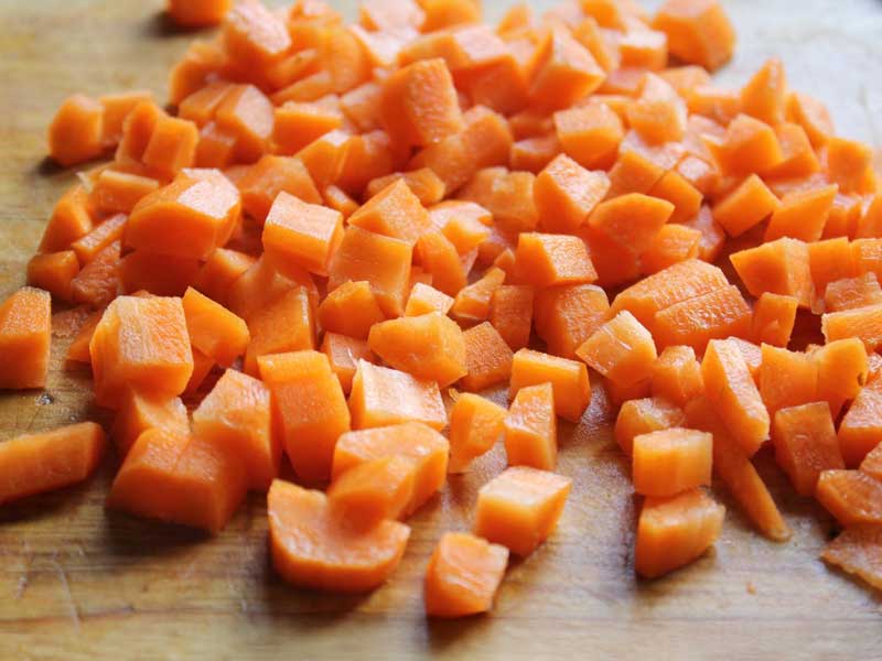 - Pelamos las zanahorias y cortamos en daditos, las cocemos en agua unos 8 minutos