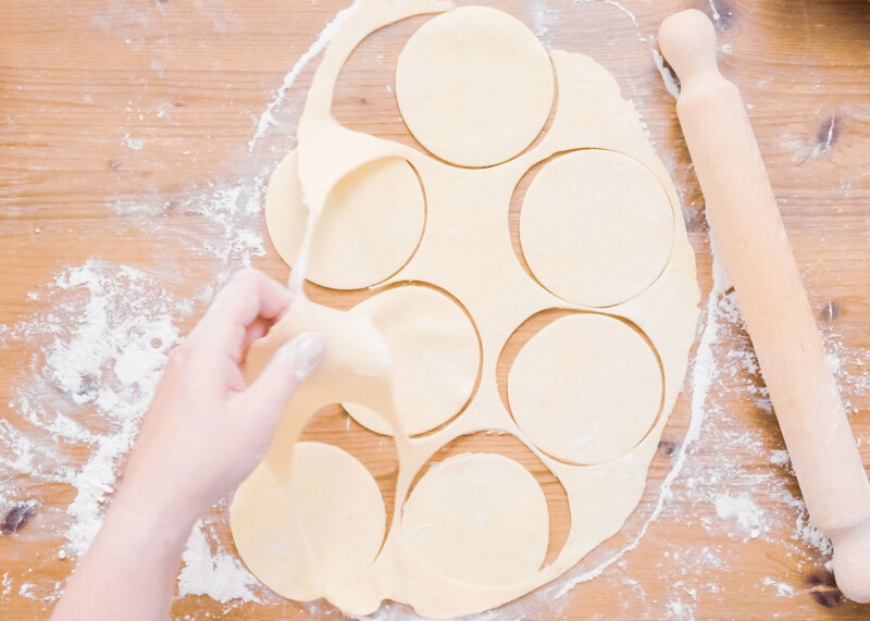 - Con un cortapastas redondo o un vaso, corta círculos de masa de aproximadamente 10 cm de diámetro.