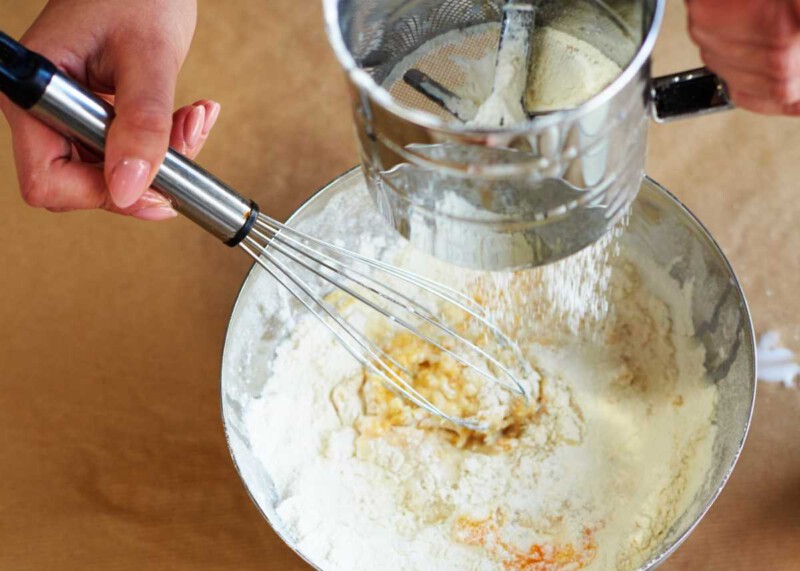 - En un bol grande, tamiza la harina y forma un volcán en el centro.