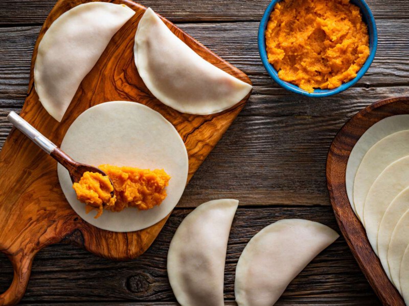 - Coloca una cucharadita del relleno de boniato en el centro de cada círculo.